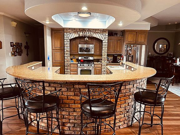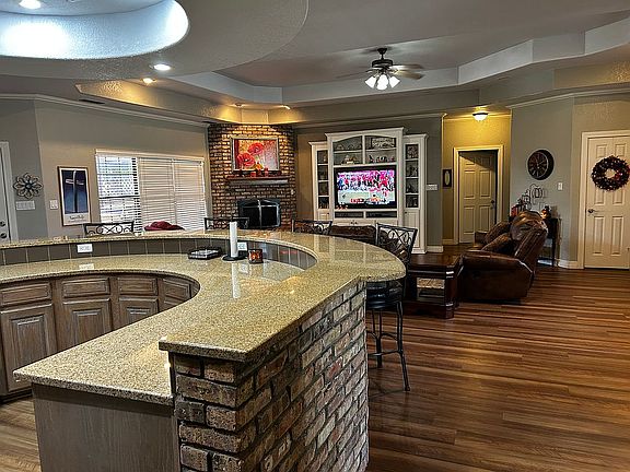 Out back is our favorite spot- a beautiful backyard oasis with an outdoor kitchen, putting green, and a new hot tub. The sprinkler system keeps everything green, and there are two storage buildings for all your extras. This home is move-in ready, comfortable, welcoming, and located in one of the most desired neighborhoods in Portales.