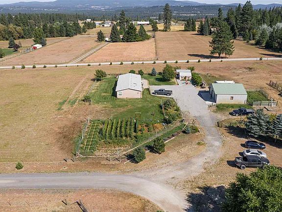 THE SUNFLOWERS ARE IN FULL BLOOM BUT NOT FOR LONG! Awesome acreage and/or horse setup situated between Deer Park/Spokane. Paved all the way here except for the driveway. Level ground with no mountain roads to climb in the winter only picturesque mountain views to look at all year around. 3 car unattached garage/shop, shed, plus extra outbuilding for use as chicken coop, storage or a workspace.
