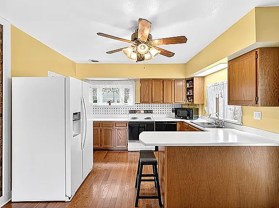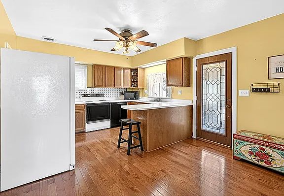 Beautiful, red farmhouse-style home on a spacious end lot in a walkable town! This is the dream home you've been waiting for. The white trim detailing and front porch are so charming. Enter into the open living/dining room. Notice the beautiful, hardwood floors throughout. The charming kitchen with a timeless black and white tile backsplash even has a side porch with another entrance to the home. Enjoy your morning coffee in the sunroom off of the kitchen. The bathroom and bedrooms are located conveniently on the second level. Enjoy the fireplace in the primary bedroom. Exposed brick walls give the home a rustic feel. Enjoy the spacious back yard with stone retaining walls. The corner lot allows easy access to the yard. Take a stroll down Main Street to visit coffee shops, shopping, and restaurants. Make the beautiful red farmhouse on East Main Street your beautiful home today!