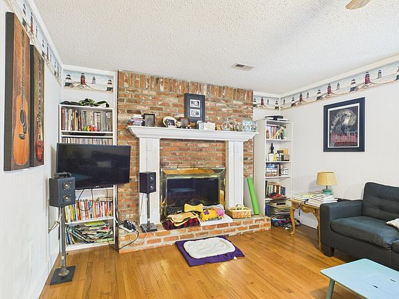 Beautiful brick-face wood-burning fireplaceBrick ranch homeMature treesCozy family roomSpacious screened-in back porchArched entryway