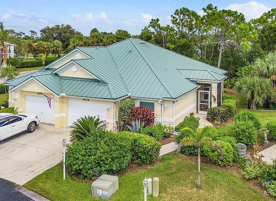 Turnkey-furnished and move-in ready, this beautifully updated 2 bed, 2 bath condo with attached private garage is nestled on a quiet street in Burnt Store Marina. Enjoy the comfort of a single-family home without the exterior maintenance! The split-bedroom layout offers privacy, while the central open kitchen flows seamlessly into a light and bright great room with volume ceilings. Sophisticated paint colors, tile and wood-look vinyl flooring, and new carpet in the guest bedroom add style to the inviting ambiance. The updated kitchen features new cabinet fronts, quartz countertops, tile backsplash, under-cabinet lighting, stainless appliances, stone front on the breakfast bar and a custom extended dining counter for added space. Bay windows in the dinette overlook a rare expansive side yard while the private screened lanai offers a peaceful tropical backdrop. The remodeled primary bath features a contemporary vanity, new fixtures, new flooring, extra linen storage, and beautifully updated walk-in shower. Additional features include a screened front entry, all new hurricane-rated windows, accordion hurricane shutters on the lanai, new washer, new water heater and an attractive front door with leaded glass for added natural light. Located in a non-flood zone, this home is perfect for seasonal retreats or full-time living in paradise!