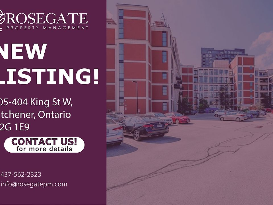 Modern 1-Bedroom Condo at 404 King St W, Kitchener 515 Sq Ft Welcome to 405-404 King Street West, a stylish 1-bedroom, 1-bathroom condo offering 515 sq ft of thoughtfully designed living space in the heart of downtown Kitchener. Perfect for young professionals, students, or those seeking a low-maintenance lifestyle, this unit combines modern comfort with unbeatable convenience.The open-concept layout features a bright living area with floor-to-ceiling windows, a sleek kitchen with contemporary finishes, and a well-sized bedroom with ample closet space. The bathroom is modern and functional, providing everything you need for comfortable city living.Located steps from restaurants, shopping, transit, and all that downtown Kitchener has to offer, this condo is the perfect balance of lifestyle and location. Don't miss your opportunity to call this vibrant community home.