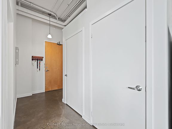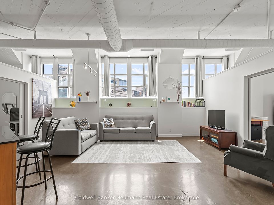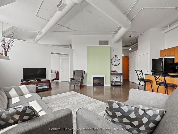 Exceptional Loft Living in the Iconic Kaufman FactoryStep into the largest unit in the historic Kaufman Boot Factory a rare opportunity to own over 1,000 square feet of stunning loft-style living.This spacious two-bedroom, two full 4-piece bathroom condo combines heritage charm with modern comfort, featuring soaring 12-foot ceilings, a fireplace, expansive vintage factory windows, and polished concrete floors that exude industrial elegance.Freshly painted and thoughtfully updated with new custom curtains, this bright and airy unit offers both style and function.The building offers a rooftop deck with a gas BBQ and a fire table.Enjoy the convenience of two dedicated parking spots and a private storage locker an uncommon luxury in loft living.Flexible move-in date available. Dont miss your chance to own a piece of Kitcheners industrial history, reimagined for contemporary urban life.