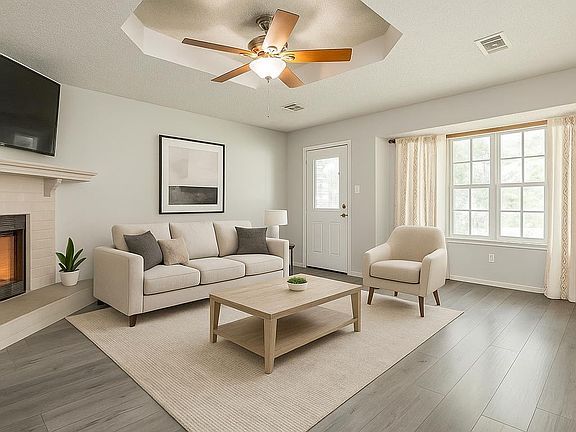 Primary suiteVaulted ceiling detailCozy fireplaceSleek floors