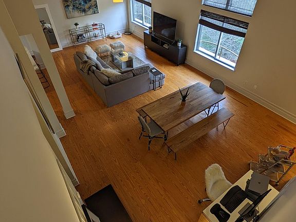 Penthouse loftSoaring ceilingsSleek quartz countertopsHardwood floorsOpen floor planModern kitchenSpacious upstairs loft bedroom