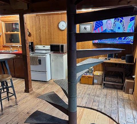 - Bathroom - Stall Shower, Open Floorplan, Spiral Staircase, Unfinished Walls, Paneled Walls
