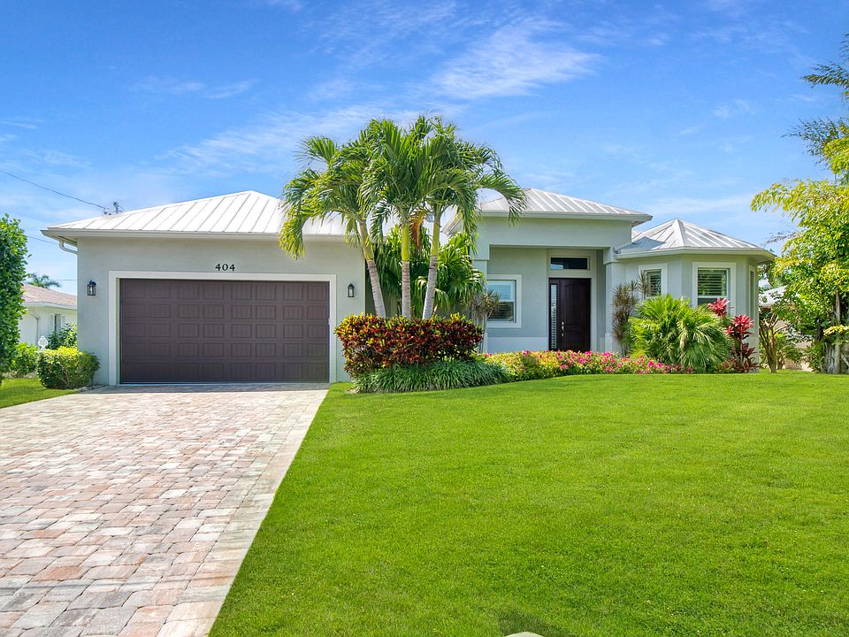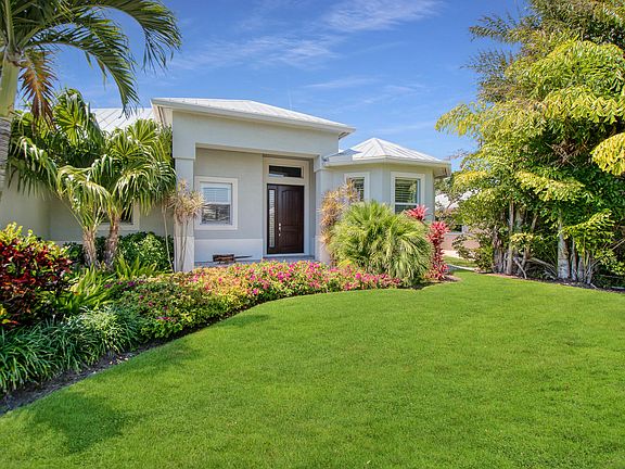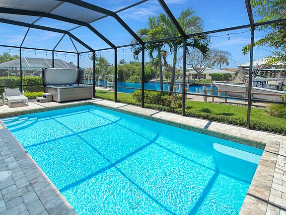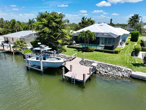 Welcome to paradise! Gorgeous Coastal Modern home with direct quick access to the Gulf of Mexico. Custom Built in 2017, this home has an open floor plan with 3 oversized bedrooms & 2 bathrooms. Features include a 25 x 25 Great Room with 12' volume ceilings, a 15 x 20 kitchen with custom cabinets, beautiful Pompeii Quartz Island & countertops, stainless steel appliances & stainless steel Farmhouse sink. Built to last with CBS construction, metal roof, hurricane impact sliders & windows. Mature, lush private tropical landscaping with Zoysia Grass, brick paver driveway, two car garage with ample storage. Out back you can lounge around the spacious lanai or take a dip in the 28x14 heated, saltwater pool, while you enjoy breath taking sunsets year round. The 40 x 15 boat dock with Aztec decking & 10,000 Lb. boat lift makes getting out on the boat a breeze.