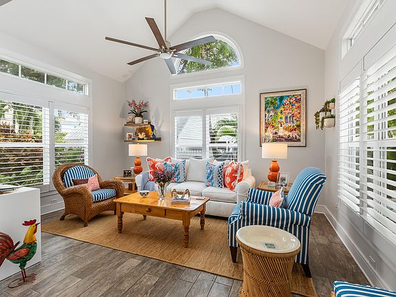 404 Porter Lane is located in the sought Porter Court community inside the Truman Annex where Duval, shops and restaurants are only a short stroll away. Homes rarely come on the market at Porter Court and 404 Porter Lane is a rare find. This corner unit is flooded with natural light from windows on three sides. It features private front and rear porches and an excellent location within the community. A cathedral ceiling and tall windows in the living room opens the space to the outdoors offering views of tropical foliage including orchid laced palm trees. This stunning home is being sold fully furnished with the high end custom furnishings that create a sophisticated yet relaxed island atmosphere. The dining room looks out to the private front porch and a garden. The upgraded kitchen with stainless appliances features a breakfast bar. A first floor bedroom with adjoining bath is an important feature and offers a large closet and views of a garden. There is a pantry and storage closet on the first floor. The primary suite is very spacious encompassing the entire second floor and offers complete privacy. The walk in closet has custom built-ins for added convenience. The primary bath has double vanities and a large shower. The attic has been insulated and finished into an incredible storage space with pull down stairs for easy access. All the doors and windows were recently replaced and upgraded to hurricane rated. A gate from the private rear porch leads to the deeded parking. Porter Court is a small sought after enclave of only 19 units with a large pool and hot tub/spa in the center of the courtyard.There is so much to love about this property including the location, the syle and that it's in immaculate, move in condition and being sold furnished so you can just bring your suitcase and start enjoying your life in Key West.