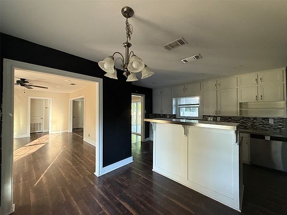 Wood privacy fenceFormal dining roomLarge back deckBeautiful laminate floorsWhite cabinetsBar seatingWhite stone exterior