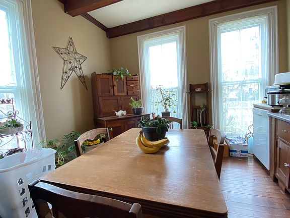 Twp story home with two garages currently housing owner and hair salon business. This could be easily converted back to single family home. Hair salon fixtures do not convey. Beautiful woodwork and hardwood floors throughout. Uniques, 11 layer, walnut front door leads into large living room with 9 foot ceilings and amazing walnut stairway. Kitchen with beamed ceiling ready for you to add your own touch with modern or classic cabinets of your own. There is plenty of room. Heat pumps supplies heating and air conditioning first floor. Second floor is heated with electric baseboard heaters. Two garages in back, one two car and on single car.