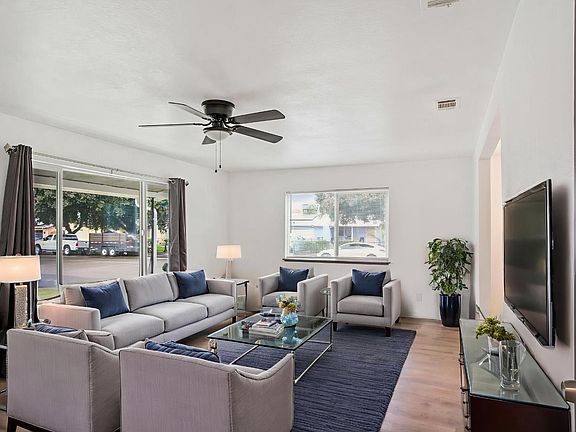 New, new, new! Step into this beautifully updated 2bd/2ba corner-lot home, where charm & modern upgrades come together seamlessly. The large covered front porch & stone-accented exterior create an inviting first impression. Inside, a bright living room with new large picture windows fill the home with natural light. The layout flows into a separate dining room & a fully updated kitchen featuring brand-new cabinetry & appliances including a SS dishwasher, microwave & stove. Ample counter space, a kitchen-sink window & an island with a breakfast bar make this kitchen both functional & stylish. Direct access to the backyard makes indoor/outdoor entertaining effortless. Both bedrooms are spacious, & the entire home has been refreshed with NEW vinyl floors, windows, fresh paint, updated stucco, ceiling fans, doors & two renovated bathrooms with new tub/showers & vanities. A newly installed fence rolls open to reveal a private driveway leading to the attached two-car garage with a new garage door motor.The large backyard offers endless possibilities for gardening & outdoor activities. Located in a great neighborhood close to shopping & freeways, this home offers convenience, comfort & nearly brand-new everything.