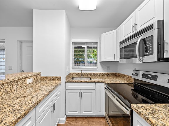 Granite countertopsPrivate backyardCorner apartmentCustom kitchen and islandRemodeled apartmentImpact windowsStainless steel appliances