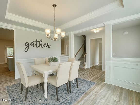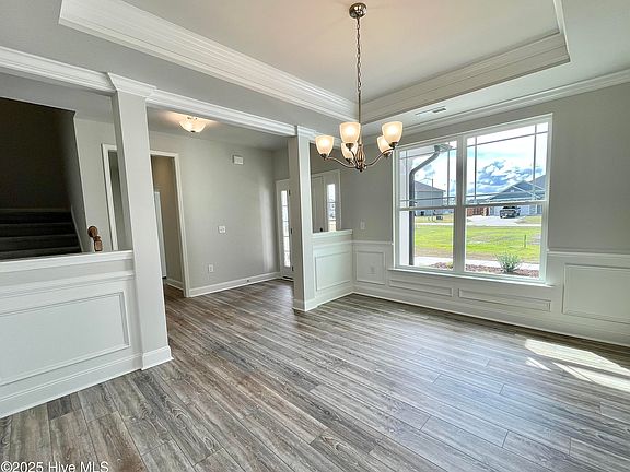 MOVE IN NOW!! This captivating 1.5 story home sits on over 1/2 acre lot that backs up to the trees. The first floor exudes elegance, from the covered porch to the cozy family room with a fireplace. LVP flooring on the entire 1st floor. The separate dining room, adorned with a trey ceiling, sets the stage for memorable moments. The gourmet kitchen, granite countertops, upgraded SS appliances, kitchen island, ceramic tile backsplash, is a chef's dream. Smooth 9-foot ceilings enhance the spacious feel throughout. The primary bedroom is a tranquil haven with a trey ceiling and crown molding. Primary bath is a spa-like retreat with a garden tub, ceramic tile shower, double vanity, water closet and walk in closet. Additional features include another bedroom, full bath, office (with closet), den (with closet), half bath, laundry room, and a walk-in pantry. The 2-car garage is finished with door opener, and a covered patio beckons for outdoor enjoyment & fun! Upstairs, a private retreat awaits with a bedroom and full bath, perfect for guests. The spacious bonus room offers limitless possibilities. There is a Natural Spring on property. Can be made into a backyard water feature. Located in a community with NO CITY TAXES!! Just 8 minutes from Seymour Johnson AFB and under 12 minutes from shopping and dining. Don't miss out on this exquisite blend of luxury and convenience!
