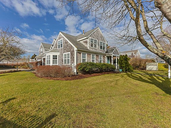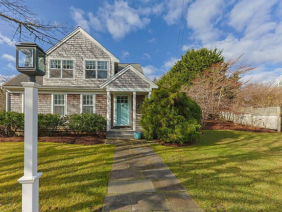This stunning cedar-shingled, four-bedroom residence is just a short stroll from beautiful Chatham Village, Oyster Pond, and Stage Harbor. The home features many custom updates, numerous amenities, and fine details throughout. Custom tile work and high-end finishes create a luxurious atmosphere. The cozy interior exudes a beach cottage ambiance, highlighted by a great room equipped with a gas fireplace, a coffered ceiling, a wine fridge, and pegged hardwood floors. A sliding glass door off the great room leads to a private deck and patio, as well as a professionally landscaped yard with stunning stone walls. The custom kitchen includes a gas range, granite countertops, custom tile work, custom cabinetry, and a spacious kitchen island, making it a chef's dream. On the first floor, there is a bedroom with an adjoining full bath. The second level features a superb primary suite with a cathedral ceiling and another gas fireplace. The luxurious full bath boasts a jetted tub and more custom tile work. Adjacent to the primary suite is a balcony that offers distant views of Nantucket Sound. This floor also includes two additional bedrooms adorned with custom murals, along with a full bath. The finished basement adds even more living space, accented with custom murals and comprising three separate rooms, plus a half bath. Enjoy being close to town while living in a neighborhood of fine homes. A custom-designed paver driveway leads to an oversized one-car garage. The lawn features an irrigation system, and there's ample room for a pool.