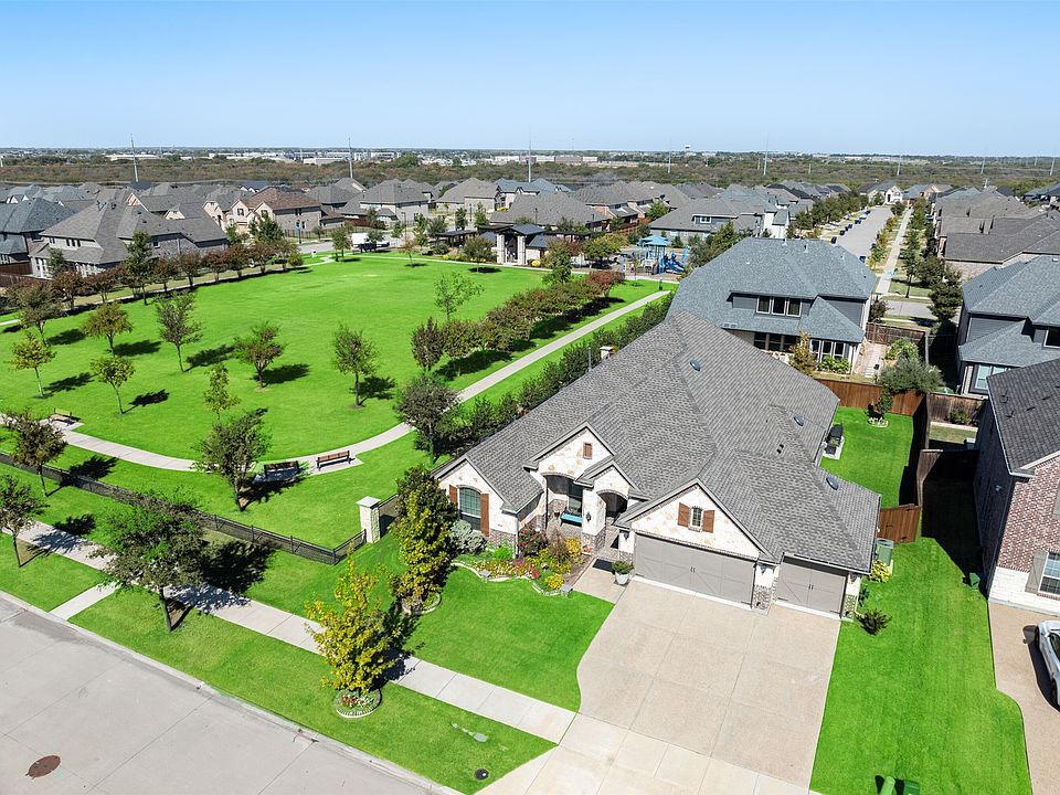 One-Story Multi-Generational Living on a Premium Greenbelt Lot! This meticulously maintained home offers an ideal layout for multi-generational living. Top rated Frisco ISD! The private in-law suite includes its own living area, kitchenette, quartz countertops, and walk-in tub. The main kitchen is equipped with stainless steel appliances, double ovens, and quartz countertops. Dishwasher in main kitchen installed 2024. Beautiful wood floors run throughout the main living areas, complemented by upgraded ceramic tile in the bathrooms and granite countertops in the primary baths. The spacious living room features a striking decorative stone fireplace—perfect for cozy evenings at home. Additional recent upgrades include an HVAC system (2025), two Honeywell thermostats (2025), and two reverse osmosis water systems. Enjoy outdoor living with an extended covered back porch, lush professional landscaping, and custom brick-and-mortar planters in both the front and back yards. Jellyfish lighting enhances curb appeal and adds year-round charm. Situated on a premium lot adjacent to a spacious greenbelt, this home truly combines comfort, thoughtful design, and modern upgrades—don’t miss this rare opportunity!