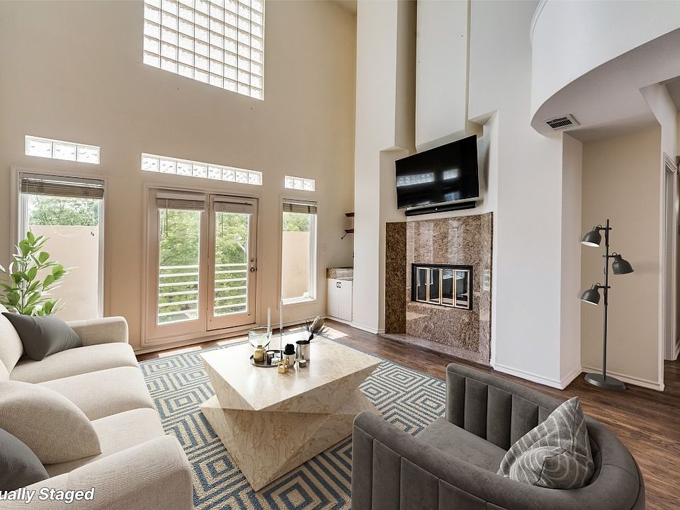 Walk to Shops of Highland Park, Glorias, Whole Foods & Eatzis. Rare end unit is the largest & most sought after floor-plan (only six) in the community. Natural light & dimmable halogen bulbs create a stunning ambiance amongst 30 ft soaring ceilings. Remodeled to open up the space for entertaining, a wood-burning fireplace, wet bar, hardwood floors & access to a balcony for outdoor cooking & dining. The kitchen offers granite counters & Samsung appliances while a mahogany island with quartz top, custom-built cabinets. Upstairs master suite features an offset sitting room with access to a secluded patio in the tree-tops. Recent improvements include carpet, outdoor patio turf, fresh paint outdoor stairs & landing, interior paint in guest rooms & kitchen cabinets, a double vanity in master bath, frameless shower, two new toilets, & professional air duct cleaning. Two reserved parking spots in the garage, a garden courtyard & rare community swimming pool in the coveted “So-Hi” neighborhood.