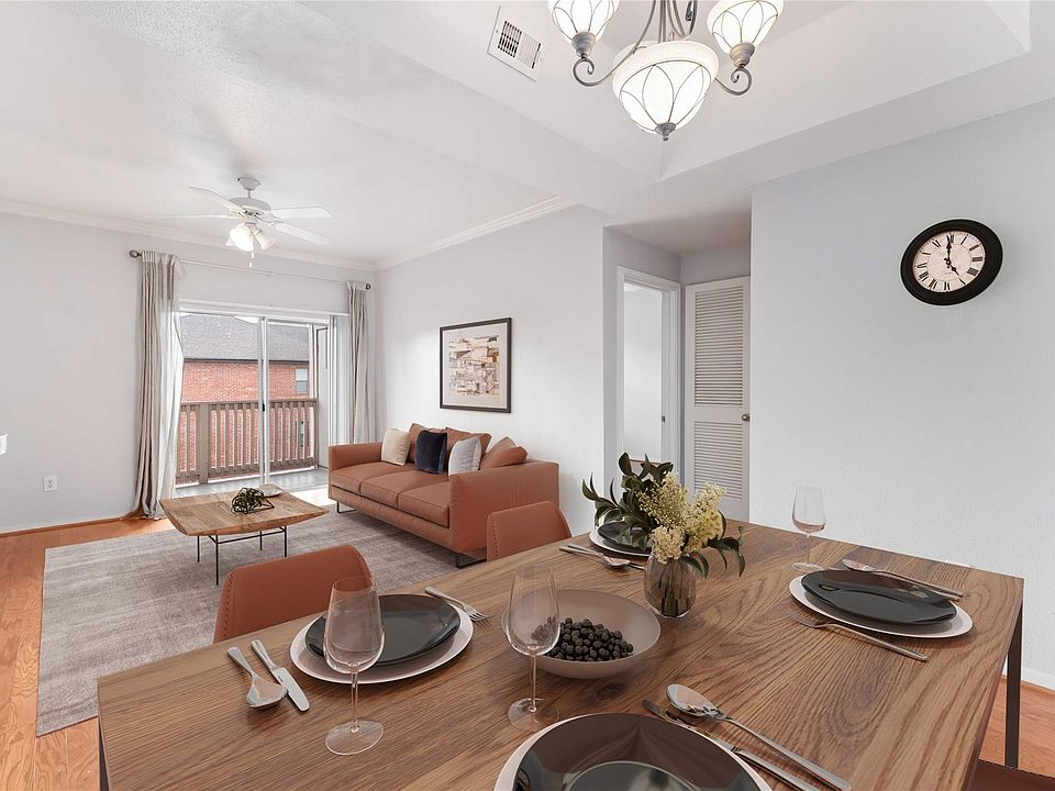 Cozy fireplacePrivate balconyWood and tile flooringDedicated dining area