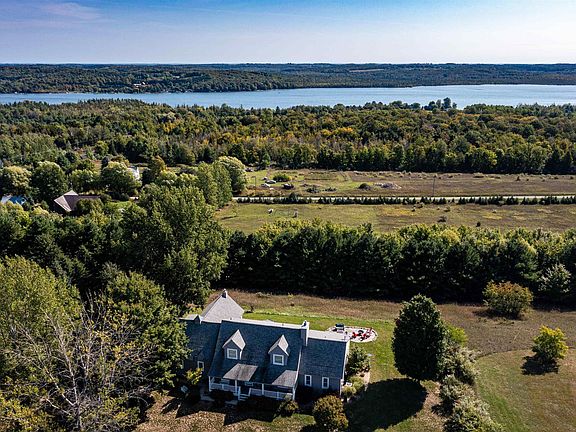 Experience the serene beauty of Lake Leelanau with peekaboo views from this impeccably crafted home nestled on over 2 acres in the tranquil surroundings of Leelanau County. With both a covered front porch and a welcoming back deck, you'll have the perfect vantage point to savor every sunrise and sunset. The master bedroom boasts a lofty ceiling, a spacious walk-in closet, and enchanting water views. The master bathroom offers the comfort of radiant floor heating, a beautifully tiled walk-in shower, and dual sinks. The expansive kitchen is a chef's dream, featuring elegant quartz countertops, top-of-the-line appliances, a generous pantry, and a convenient island with seating. Unwind in the den by the unique Tulikivi soapstone fireplace, an exquisite centerpiece. Upstairs, you'll find three additional bedrooms and two more well-appointed bathrooms. The finished lower level opens up a world of possibilities. This home includes both an attached garage and a detached two-car garage across the road. It's also wired for a whole-house Generac generator, ensuring your peace of mind. Meticulously maintained and updated with the latest features, this property offers a truly exceptional living experience. All data and measurements are believed to be accurate but should be independently verified by the buyer and/or their agent.