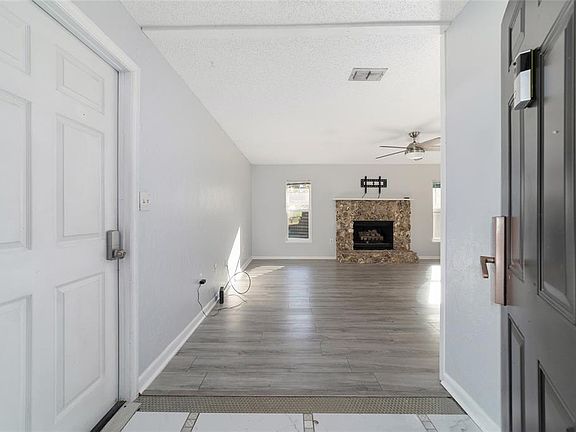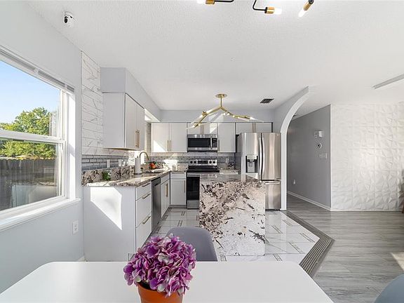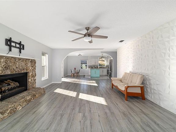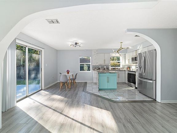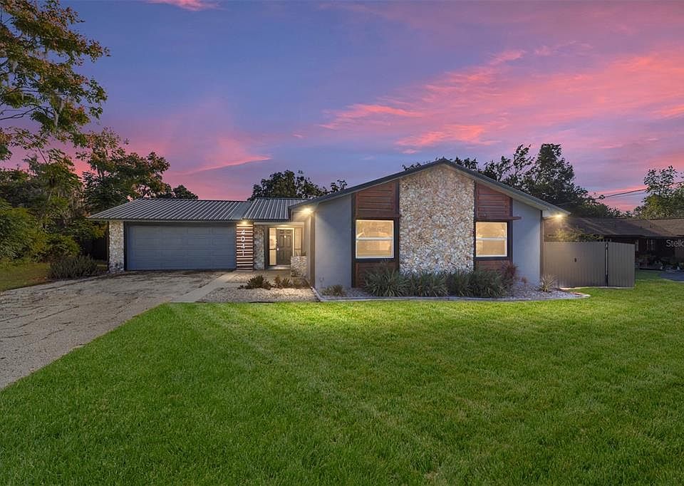 Welcome to the attractive Citrus Park neighborhood of Ocala, Florida. NO HOA restrictions! This home features three bedrooms, two full baths, a 2025 metal roof, a fresh exterior paint job in 2024, a 2020 A/C system, and a 2025 garage door with safety sensors. The garage has insulation in its ceiling and is equipped with a 2024 A/C unit for climate control, a washing machine, a dryer, and electrical outlets so you might even want to use it as a workshop or flex space! The driveway and front yard provide suitable parking for guests. The 2024 sturdy metal PRIVACY FENCE wraps around one side of the house and has a gate. An electronic door lock offers multiple entry options. Inside, modern fixtures, gorgeous tile, high-quality flooring, remodeled bathrooms, and remodeled kitchen. The sliding doors provide natural light and lead outside to a patio, deck, and fire pit plus ample space for pets, a garden, and outdoor activities!