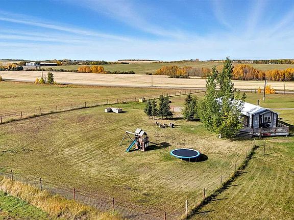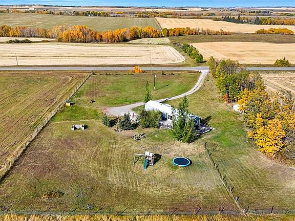 Your dream of peaceful, scenic countryside living is wonderfully attainable with this lovely home, situated on 2.5 acres just 40 minutes from Calgary's North end! Also 23 minutes to Carstairs and just 7 to Cremona. Enjoy the beautiful views and the great outdoors on your own vast property! Inside the thoughtfully updated home, the open main living space feels bright and airy, with vaulted ceiling, skylight, and every window has a beautiful view! The kitchen is open to the dining space, with patio doors leading out to the deck that runs nearly the full length of the home! The living room has a cozy wood stove (cleaned including chimney, painted, recent WETT inspection). The primary bedroom is conveniently located by the laundry space, and features a spacious full en suite! On the other side of the main living area, a 2nd full bath serves the 2 secondary bedrooms. Updates by the current owners include: interior and exterior paint, all new flooring, baseboards, toilets, showerheads, and added insulation underneath. Updates noted by previous owner: hot water tank (2023), forced air furnace, 100 amp electrical panel, washer/dryer, new windows. The metal shed, chicken coop, gazebo, tent shelter, play structure, and trampoline are all included!
