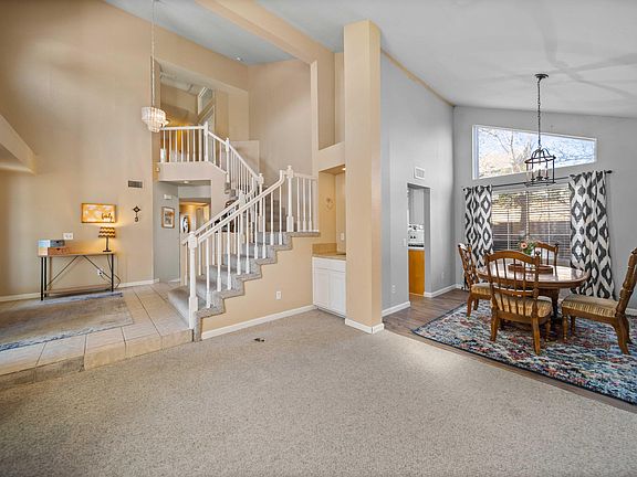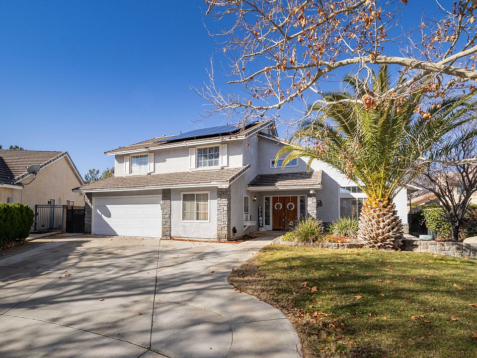 You read that right, 6 bedrooms! 2 downstairs plus bathroom with walk in shower. As you enter, you will sense the spaciousness of the home from the 2 story high ceilings in the living and dining rooms. The kitchen has been tastefully upgraded with quartz counters, wood cabinets, open shelving, walk in pantry, breakfast bar open to the family room and overlooking the serene backyard patio. The generously sized primary bedroom is located at the top of the stairs with large walk in closet and a spa like bath boasting a jetted tub to soak in after a long day. The other 3 bedrooms are a good size including the enclosed loft that has been converted to a large bedroom. There is plenty of room in the backyard for endless possibilities. The A/C is less than a year old and the evaporative cooler will cool the entire home as well. Enjoy low energy bills with the solar! Located at the end of a cul-de-sac in a fantastic neighborhood in Rancho Vista with highly sought after schools.