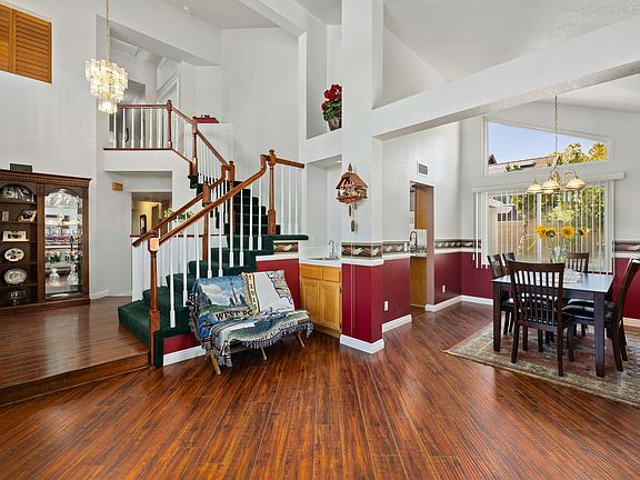 Upstairs, a generously-sized primary suite, complete with built-in jacuzzi-tub, shower and dual vanities. Off the primary bedroom, sliding-glass doors lead out to a large balcony overlooking the back yard and sparkling pool below. Also upstairs is a large office with a very interesting granite desk, several work stations that could be used for homework or a small in-home business and built-in cabinets. The back yard is a peaceful oasis with refreshing pool, a warm jacuzzi and a small, low-maintenance lawn. Recently installed, a brand new spa heater to provide your family with years of comfort and relaxation.  Cap it off with a lovely and useful covered patio to protect you from sun and rain. Easy access to freeway, parks and shopping. Don't miss this elegant home!