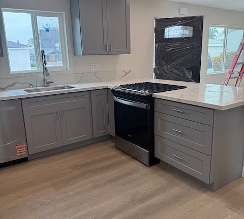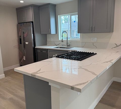 The kitchen has been fully upgraded with sleek quartz countertops, custom cabinetry, and stainless-steel appliances perfect for both everyday living and entertaining. The living area features new flooring, recessed lighting, and a fresh, neutral color palette that complements any decor.