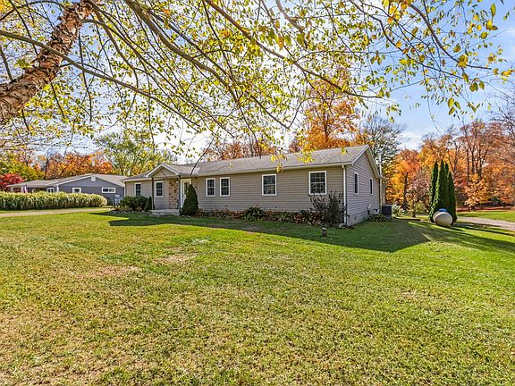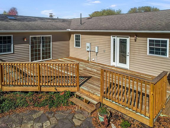 Lovely ranch on this expansive 4-acre wooded lot, complete w/ a fully stocked small pond. The home features 3 bedrooms, along w/ 2 versatile additional rooms that can effortlessly serve as bedrooms, totaling 5. The great room, w/ vaulted ceiling, pairs perfectly w/ the enormous kitchen that boasts extensive counter space, gorgeous hickory cabinets & beautiful solid oak flooring. The walk-out lower level is a blank canvas, ready for your personal touch, while also providing generous storage options. Heating is primarily ensured by propane, w/ the bonus of a whole-house wood-burning furnace for those cozy nights. Spacious 24x32 extended garage complete w/ a 10x32 lean-to for all your storage needs. Seize this opportunity to own a serene & versatile property!