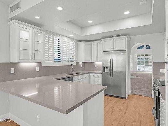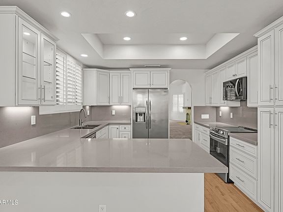 A rare find in a most convenient location of The Springs at Hidden Lakes. 24/7 intimate guard gated community with shopping, dining, freeway access, trailheads nearby. Pickleball, tennis, heated community pool and spa amidst mature landscaping are a delight. Seasonal friendly community gatherings for all. Home is one of the larger models with 3 bedrooms. Inside, abundant ambient light is enhanced by vaulted ceilings. Large master bedroom and bath. Plantation shutters in living areas. Since 2020 updates include: total remodel of kitchen, guest bath, back patio landscaping. Also added are soft water system, security door at front and gate at front patio area. Freshly painted and ready for you!