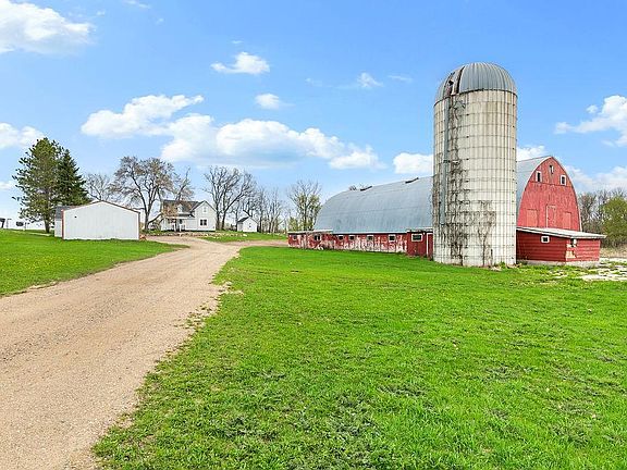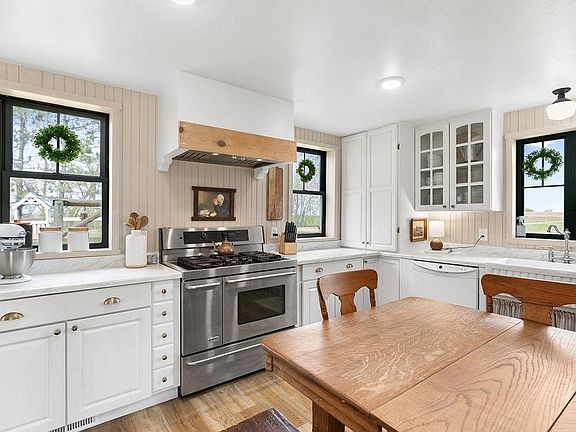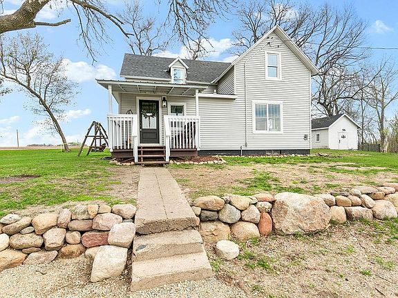 Completely remodeled Farm House! All living facilities on the main level such as the primary bedroom, full bath, and laundry. There is an additional 3 bedrooms upstairs. This beautiful property is equipped with a functioning chicken coop, 2 double stall detached garages, a large barn and pasture. Enjoy panoramic sunrises over rolling fields. **Additional gravel will be added to driveway when ground firms up. The yard is currently torn up where two buildings were taken down. Yard will be reseeded prior to closing. Siding is being replaced on the house and detached garage due to hail damage. Roof on house and detached garage have been replaced Fall of 2022.