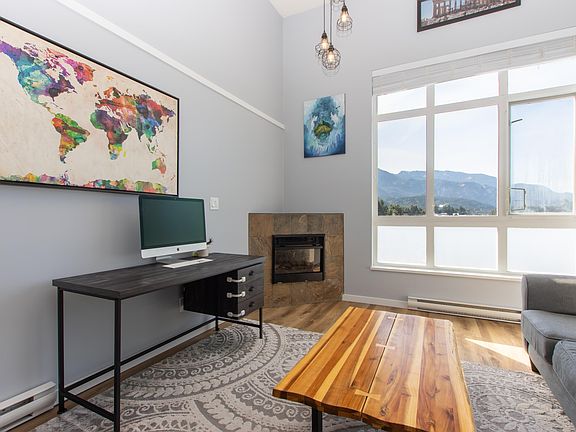 Enjoy stunning panoramic views of The Stawamus Chief, Sky Pilot & Coast Mountains from this top floor Spectacle condo. The spacious 2 bdrm, 2 full bath home boasts an open concept layout with 14' ceilings, a living room flooded w/ natural light & warmed by a corner fireplace, easy care laminate & tile floors, a primary suite with walk-in closet, 3 pce ensuite & extra room for an office area or additional storage, in-suite laundry, efficient kitchen & balcony. To make your active lifestyle a bit more convenient, enjoy the common area fitness center, secure bike storage and walking/biking distance to all amenities - shopping, restaurants, cafes, world class hiking & biking trails, Squamish Valley Golf, Squash & Curling Clubs. A short 35 minutes to both Whistler & North Vancouver.
