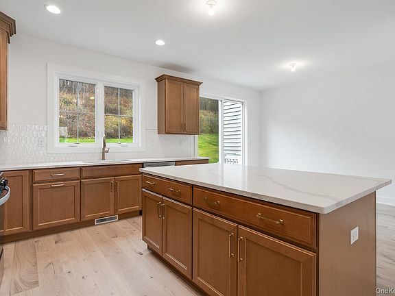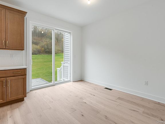 Brand new and never lived in, this luxurious two-bedroom townhouse is located in the desirable Van Wyck Mews community in Fishkill. This popular design includes a separate study that functions perfectly as a third bedroom or home office. Enjoy an open concept layout featuring a spacious living room, dining room, and breakfast area that flows seamlessly into the designer kitchen. The kitchen showcases upgraded cabinetry, quartz countertops, exterior-vented cooking, Kohler sink fixture, and stylish brushed bronze hardware. Oversized windows fill the home with natural light, highlighting the wide-plank white oak flooring and elegant high-end finishes throughout. A sliding glass door leads to a paver patio, ideal for outdoor dining or relaxing. The primary suite offers a vaulted ceiling, walk-in closet, and a spa-like bathroom with a double vanity and frameless walk-in shower. Additional highlights include upgraded lighting fixtures, Kohler fixtures, security system wiring, energy efficient HVAC system, and an oversized 2 car garage. All set on a premium homesite overlooking a forever-green buffer. The resort-like community amenities include a clubhouse, fitness center, playroom, pool, and park. Convenient southern Dutchess location, close to Main Street in Fishkill, shopping, restaurants, schools, I-84, and only 8 miles to the Metro North Train Station with a direct express line to Grand Central Terminal. Builder's warranty from Toll Brothers transfers to the new owner.