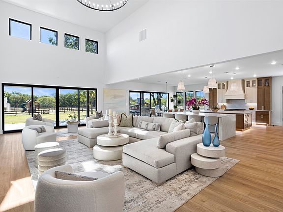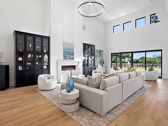 Inside, soaring ceilings and a floor-to-ceiling fireplace set the tone in the living room, framed by custom cabinetry and a wall of windows that capture breathtaking views of the property. The adjoining kitchen is a true showpiece, offering dual waterfall-edge islands, designer lighting, and a full suite of professional-grade appliances. Cabinet-front Thermador refrigerator doors seamlessly blend with the custom cabinetry, while a hidden butler’s pantry and an oversized walk-in pantry provide functional elegance. A dedicated wine room with cooler adds a sophisticated touch for entertaining.