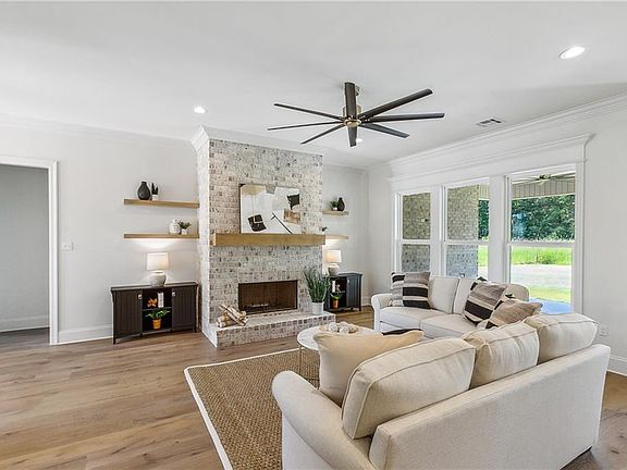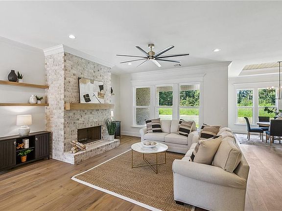 This new GMI Construction home in Southern Oaks is ready for new owners! The fabulous open floor plan boasts 4 bedrooms and 2.5 baths and there is a convenient separate office off the living area that looks out to the street. Wood floors are in all living areas as well as the office and the primary bedroom. The chef of the house will love the well-equipped kitchen with the large island (and additional storage below!), Quartz countertops, under cabinet lighting, the white porcelain farm sink, the stacked cabinets to ceiling, 5 burner cooktop and wall oven as well as a walk-in pantry. The dining room has a tray ceiling with stained wood inlay and windows on two sides of the room looking out to the rear yard. The brick fireplace with a beam mantle is the focal point of the den/living room. The primary bedroom has a beautiful coffered ceiling and the primary bath includes a stand alone tub, dual vanities, large shower and custom closet. The laundry room opens to the hallway as well as the primary closet for convenience. The second bath includes dual vanities and a tiled tuben closure. The covered patio overlooks the large backyard. The subdivision pool will be finished in approx one month, just in time for summer. Great school district and flood zone "C". Come make this house your home!