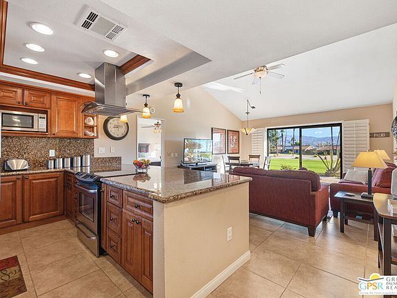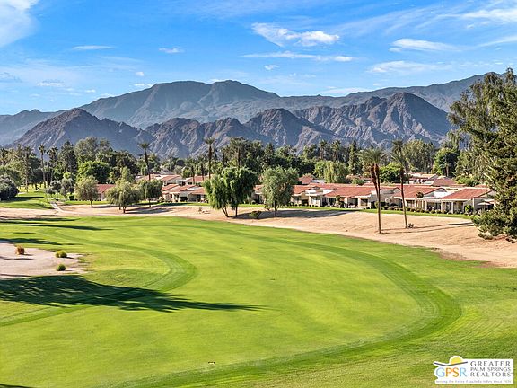 It's all about location for this popular Vintage Model Plan within the gates of Palm Desert Resort CC overlooking the 13th fairway with elevated views of golf course and mountains. Upon entering, you'll be awed by the light and bright feel with open concept kitchen with expansive peninsula counter top with barstool seating and cabinets galore. Intelligent floor plan with owner's suite and bath is on one side of the home and guest bedroom and bath on the opposite, which is perfect for privacy and separation and makes this the most popular model. Completely relax in the back patio with an extended patio while enjoy the east facing mountains that emits a purple during certain hours called the "amethyst hour". Offered furnished per inventory list to help for immediate enjoyment. Palm Desert Resort CC features 18-hole championship golf course, newly renovated clubhouse, 20 pools and spas, and the Coachella Valley's premier pickleball and tennis club. Triple threat home makes it a perfect for primary residence, vacation rental or second home.