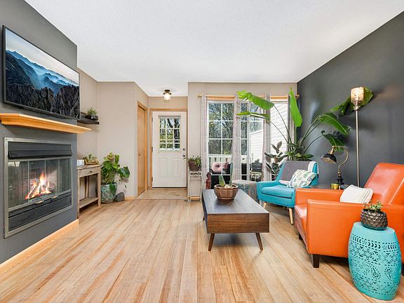 Step into this delightful townhome nestled at the end of a quiet street. This cozy residence boasts two bedrooms, one bath, and an attached garage. No neighbors across the street plus the convenience of extra parking! The main level family room features bamboo flooring, gas fireplace, and large double paned windows that extend to the outdoor patio through a sliding glass door. The kitchen is complete with stainless steel appliances, stunning granite countertops, a large double basin sink with garbage disposal, a gas stove accompanied by a range hood, and painted oak cabinets. Conveniently tucked away on the main floor is the laundry area. Step upstairs to discover a full bath with a granite countertops vanity, along with two bedrooms, including a spacious master suite with a walk-in closet. Award winning Mounds View school district. Only blocks to Snail Lake Regional Park, Island Lake Park, grocery stories, shopping, and highway 694. A perfect home and location!