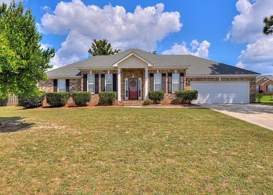 Hard to find all brick one level home with a two car garage featuring a split floor plan for owner privacy! Just minutes from Ft Gordon's Gate 2, Interstate 20,Bobby Jones Expressway, restaurants and shopping. Nice foyer adjacent to the formal living area/ office and formal dining room. Kitchen has stainless steel appliances, breakfast bar and breakfast area. Family Room has that open feeling with high ceiling and fireplace! Owner bedroom is tucked away at the rear of the home with walk-in closet, his and her vanities, garden tub and separate shower. Ceiling fans and moldings throughout. Nice privacy fenced rear yard with storage building. Huge open side yard. One third of an acre corner lot. New HVAC 2019, Roof 2015, water heater 2019.