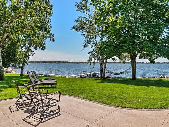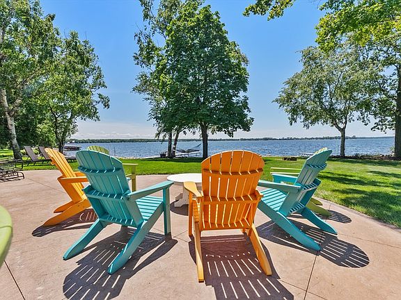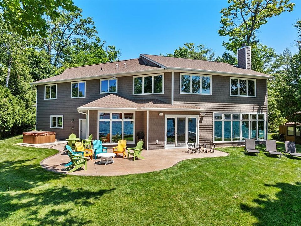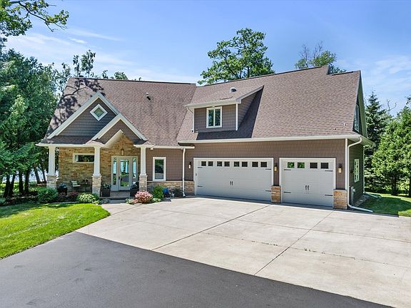 4 bedroom on Riley's Bay with sunset views and plenty of green space & enjoy water activities on the shoreline. Each room has large Andersen windows & patio doors to view the beauty of the Bay. The lot is .81 acres with 104' of frontage & the parcel owns part of the peninsula. 3763 sq ft house built in 2012 with custom cabinets, wide trim, hardwood floors, beautiful stone extra-large fireplace & 10 ft ceilings. Bar area has wine & beverage fridge. Primary bathroom has 6 x 6 walk-in shower. There are two other full baths, one on the 1st floor & the other on the 2nd floor plus and outdoor shower. 2nd floor Rec room and laundry room. The 32 x 36 out garage has 220 power. New Certain-teed siding in 2023. Dock and lift station included.