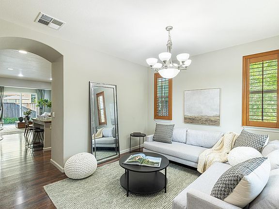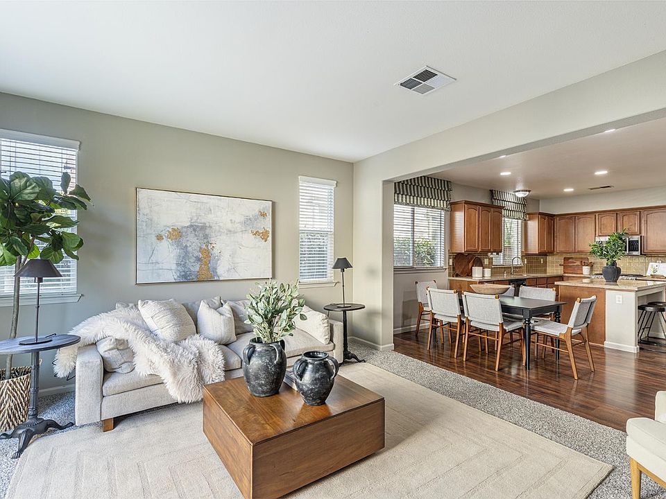 Fresh Move-in ready home with a flexible floor plan and well-designed spaces throughout. This former model 3-bed, 3.5-bath home includes a spacious loft that serves as an office and media room or could easily be converted into a 4th bedroom. The main level features an open-concept kitchen and family room with stainless steel appliances, walk-in pantry, and breakfast bar. Thoughtful built-in cabs plus a formal living or dining room near the entry and convenient powder room. Upstairs, the primary suite includes dual walk-in closets and large en-suite bath with dual vanities, soaking tub, separate shower, and private water closet. The private 2nd bed includes its own en-suite bath, while the 3rd bedroom is adjacent to an additional full hall bath and the loft area. Highlights include solar, central A/C, indoor laundry room, and an attached 2-car garage. Ideally located near shopping, dining, and neighborhood parks, offering comfort, flexibility, convenience and low-maintenance.