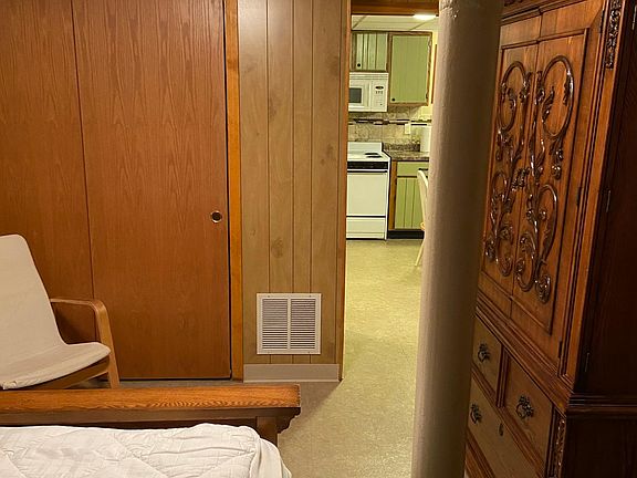1 BR/1 Bath downstairs apartment with outdoor deck, furniture provided, in a four-unit building, apartment building. Kitchen has a table and 2 chairs. Bedroom has Queen bed, bathroom has shower only, no tub, and a low ceiling. Coin-op laundry in building, off-street parking in private lot. Utililties included, cable/wifi NOT included. Rental agreements are month to month.