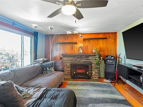 Partially finished lower levelWalk-in closetWood butcher block countertopsWood-burning fireplaceBreakfast barSparkling appliancesWood plank floors