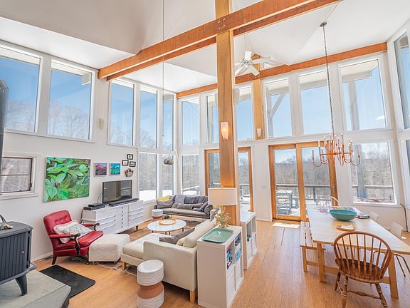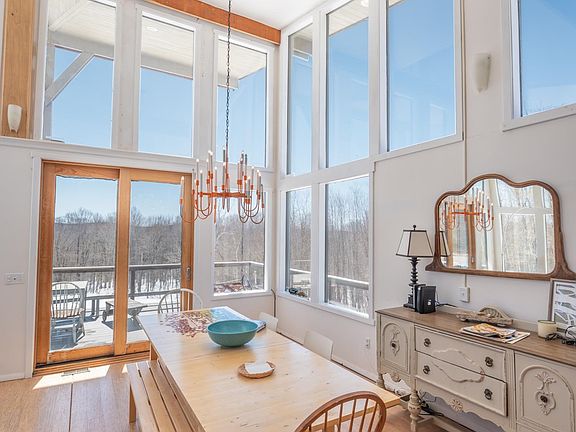 Stunning architect designed contemporary farmhouse on 10+ acres, just up from Wards Cove public beach on Lake Whitingham, and a short drive into the country village of Wilmington, and Mount Snow ski resort. This home sits on an idyllic country road with horse pasture and farmhouses, in a beautiful and private location, yet with easy access. Set back off the road, you will find utter serenity in this pastoral location. Inside is a large open floor plan with floor to ceiling windows and exposed custom woodwork in the barn style great room. There are wood floors, a large modern kitchen, wood burning stove, amazing natural light thanks to southern exposure, and ample entertaining space, which includes the large covered porch. The main floor also has a primary suite with tiled shower, two guest bedrooms and a guest bath, and your guest entry. The upstairs is a large sleeping and play loft which could easily be segmented into additional bedroom and bathroom space, all with tremendous mountain views. The lower walkout level has a large family room with high ceilings, 2 guest bedrooms, another full bath, and a mudroom entry off the two car garage. There is also a large shed on the property which is great for gear storage no matter the season. An ideal 4 season getaway in Vermont still easily accessible to all major metro areas, for your home away from home.