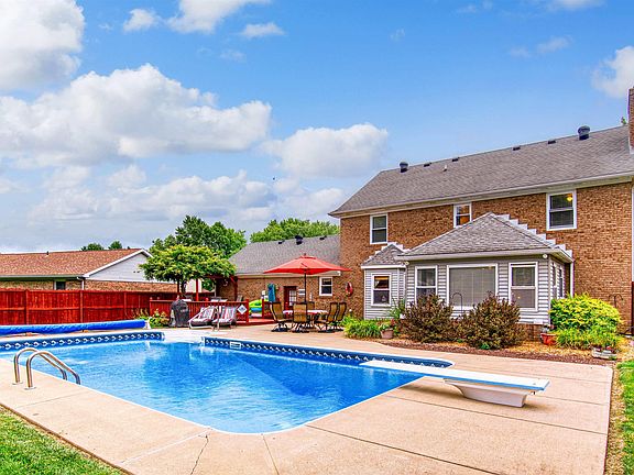 Outdoor enjoyment is easy with this home offering a large privacy fenced backyard with lush lawn, mature tree backdrop, and an in-ground pool with an abundance of patio surround. Situated in a desirable north side subdivision this 4 bedroom, 2.5 bath home with an oversized 2.5 car garage offers great curb appeal with beautiful landscaping. This home offers many updates including replacement windows, updated kitchen, HVAC, garage doors, light fixtures, pool liner, and much more! The foyer with hardwood flooring opens to two rooms perfect for dining and den/office. The great room with fireplace and hardwood flooring opens to the updated kitchen with an abundance of custom cabinetry, island with seating, pantry, and large dining area. The 14x12 sunroom is cooled and offers an additional 168 square feet of living space that is not included in the total square footage and is the perfect place to enjoy views of the pool and grounds. The large laundry with cabinetry and washer and dryer included is conveniently located off the 2.5 car garage. There is an updated guest bath to complete the main level. The second level offers a spacious owner’s suite with ensuite bath. The second level offers three additional bedrooms with access to the full hall bath. Storage is not a problem with an abundance of closets throughout the home in addition to attic storage. Family fun is easy in this fenced backyard with large green space for games, in-ground pool with patio space for lounging, large deck area for dining, pergola for shade, and shed for pool storage. This great home is located with easy access to shopping, dining, schools, and major employers.