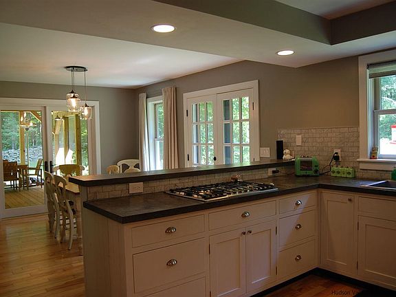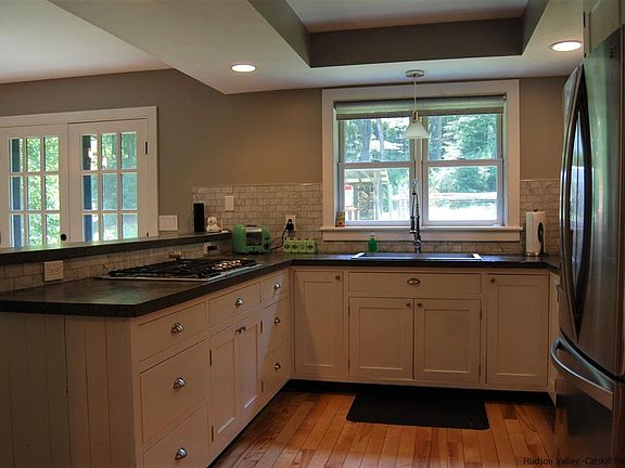This elegant contemporary farmhouse is nestled on over 4 lush and private acres on one of the most beautiful country roads in the Hudson Valley is full of sophisticated charm with loving detail! This Buck Road location offers all the serenity you expect from country life, with the convenience of being a short ride from the heart of Stone Ridge and High Falls, as well as Woodstock. This little gem has had a facelift inside and out and will capture your heart with its understated elegance! The side door brings you into a great mud-room with giant farm sink, built in cubbies, and a cleverly camouflaged laundry area, while the front door leads directly into the heart of the home; an open living area with gleaming hardwood floors, an abundance of light, a cozy fireplace and an absolutely fantastic gourmet kitchen, sporting concrete countertops, and Carrera marble subway tile. You can be part of the activity while you cook to your hearts content. If peace is what you seek, you will find the den a perfect spot. In the warmer months open the French doors and let your guests spill out onto the stunning screened-in porch overlooking lush grounds with established gardens. This is a space that you will never want to leave! The oversized master suite has dramatic vaulted ceilings, beautiful built in book cases, and a private bath en suite with a vintage tub with a view of the great outdoors. Additional bedrooms on the second floor offer plenty of space for guests including a nifty sleeping loft that will captivate the kid in all of us, as well as an additional, newly renovated bathroom. For overflow guests, there is a beautifully finished lower level complete with a kitchen and bathroom offering room for all to spread out. A remotely controled Honeywell Alarm System and Thermostat and remotely controlled door lock to make maintaining this prized possession as simple as touching a button. Located less than 2 hours from NYC and conveniently close to skiing, climbing, hang gliding, or sailing on the Hudson. Close to the Mohonk Preserve, Minnewaska's hiking and swimming holes, Woodstock, historic Kingston and Rhinebeck, all wonderful venues for dining and antiquing. A perfect getaway for entertaining friends and family, or just relaxing. Simple and elegant says it all!