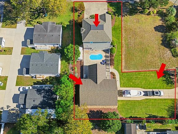 Elevate your beach lifestyle with "Mo Paul's newest Upscale Resale," a Garden City Beach compound built on two desirable lots — a turnkey retreat with room to expand and perfect for an owner looking to scale their coastal presence or launch a high-performing short-term rental. The main home offers 5 bedrooms and 5 full bathrooms (all upstairs bedrooms ensuite), an open floor plan with travertine tile, knotty-pine wainscoting, custom cabinetry, a built-in bar with wine fridge, and 2,583 heated sq ft of refined living. Ground-level living includes the 5th bedroom and full bath for easy guest access or multigenerational needs. Outdoor living is epic: a custom 400+ sq ft lanai, pool, fenced yard with new Zoysia sod, and a massive 1,400 sq ft stick-built boat house with its own heated/cooled full bathroom and a 20x20 covered patio featuring an outdoor fireplace. Practical upgrades completed in 2024 include a new roof, appliances, pool pump, and hot water heater. Additional features: HardiePlank siding, epoxy garage floor, chair lift, upstairs laundry, and Roger England craftsmanship-builder. The L-shaped, two-lot site is not in a designated flood zone, giving you ground-level build options free of elevated flood-zone constraints — ideal for adding an ADU, garage-level living, or other value-add improvements. The total property footprint is 5,530 sq ft (Under Roof), which provides substantial elbow room to adapt the compound to your vision. And guess what? NO HOA. This compound is an outstanding STR (Short Term Rental) opportunity: five private ensuite bedrooms, a separate massive boat-house with its own heated and cooled full bathroom, pool, and multiple outdoor entertaining areas create strong guest separation and premium nightly potential. Never rented — move in and operate immediately or launch a professionally managed STR with turnkey appeal. Showings by appointment only. Experience the scale and possibilities in person — this is a rare chance to own a multifunctional Garden City Beach compound built for both lifestyle and income.