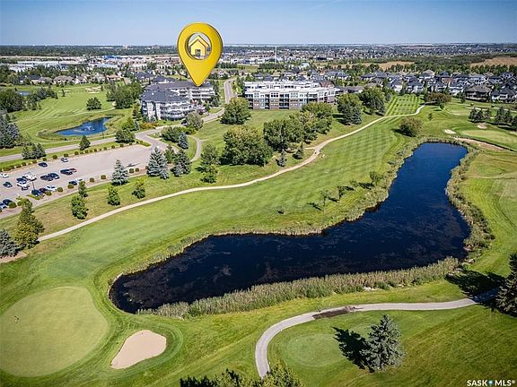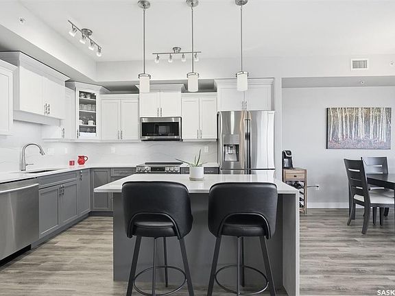 Discover this beautifully upgraded top-floor corner unit in Woodbridge II, a premier luxury condo building in The Willows by Valentino Homes. Enjoy spectacular views of The Willows Golf Course and the surrounding community, enhanced by abundant natural light from the south, east, and west exposures. With 1,565sqft of living space, large windows, and 9-ft ceilings create a bright, open atmosphere throughout. The living room, dining area, kitchen, and den all feature upgraded luxury vinyl plank flooring and fresh paint. The stylish kitchen showcases refaced cabinets, quartz countertops and backsplash, a spacious island with a quartz waterfall feature, and stainless steel appliances—all seamlessly connected to the main living space. This unit includes two bedrooms plus a den, providing flexibility for work or guests. Both bathrooms are updated with ceramic tile flooring, new lighting, and quartz countertops. The primary suite stands out with upgraded built-in cabinetry, dual sinks with prep area, a full-sized shower, and a generous walk-in closet. Additional high-end upgrades include Hunter Douglas remote-controlled blinds—plus blackout blinds in the bedrooms—and a newer central air conditioning system. The laundry/storage room offers a newer washer and dryer and a custom cabinet with slide-out shelving. Step onto the deck to enjoy the views, complete with a natural gas BBQ hookup. Convenience continues with one underground parking stall, one surface stall, and an impressive two-level storage room offering nearly 100 sq. ft. of space. Pets are welcome with board approval. This exceptional unit delivers comfort, style, and an unbeatable location in one of Saskatoon’s most desirable communities.