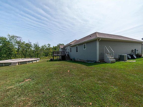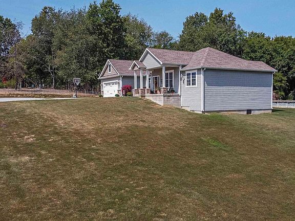 This custom built home with upgraded features situated on 4 acres north of Galatia is ready for your name to go on the mailbox! Starting with the real stone accents on the front of the house when you pull up, you will be impressed when you enter the great room with the coffered ceiling with recessed lighting and crown molding. The floors are laminate throughout the main living area. The kitchen cabinets are custom made hardwood and afford abundant storage and seating solutions at the island. The bathrooms have ceramic tile floors. The master bathroom has dual shower heads in the full size shower, dual vanities, and a jetted tub. The master walk-in closet is ample size. The laundry room features a utility sink and storage cabinets. Across the great room you will find two additional bedrooms with a shared bath in the hall. From the dining area you can head out to the deck, and on out to the backyard with the 28 ft above ground Doughboy pool. There is lots of room for 2 and 4 legs to play! Need a little more room? Expand the yard and clear a bit more of the acreage. Put this on your "to view" list.
