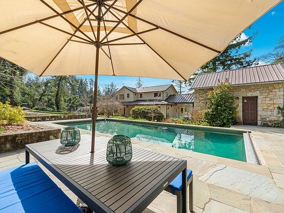 This estate set on over two acres offers a main residence, guest house and a historic stone building. The main residence is a two-story craftsman-style farmhouse. Originally built in 1920, now extensively renovated, it marries timeless elegance with contemporary updates. Almost 3000 square feet it offers a wrap-around porch, vaulted ceilings, stunning British oak hardwood floors, and a fireplace. The chef's kitchen includes a Viking range with 2 ovens, a maple block island with a baker's marble inlay, wine fridge and dining nook. Multiple French doors on the first floor allow you to enjoy the views of the property including a vineyard view. The guest house has an 800 square feet one bedroom apartment which sits above an expansive garage/workshop complex and carport (potential tenant and warehousing rental income.) Nestled alongside the pool is a 1897 stone building with a cellar below. The pool area includes an outdoor kitchen. This property is located in the coveted Howell Mountain AVA, close to Las Posadas National Forest where you will find some of the best hiking/biking trails. Note that square footage/bedroom/bath count includes the 1 bedroom apartment. Don't miss out on this beautiful private estate.