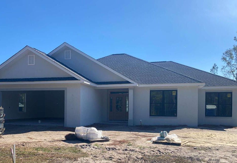 This is a beautiful 4 bedroom, 2 bathroom stucco home that has 30 year architectural shingles. The ceiling in the main bedroom is a 10' step ceiling, the foyer also has a 10' ceiling with 9' ceilings throughout the remainder of this home. This home includes a double garage with opener and 2 remotes. There are custom recessed panel painted cabinets in the kitchen, bathrooms, and laundry room with under-cabinet lighting in the kitchen. The kitchen and bathrooms feature solid surface countertops. The main bathroom is complete with a garden tub, separate shower with glass enclosure, double vanity, and a walk-in closet. Ceiling fans will be included in the great room, bedrooms, and on the back porch. Crown molding will be installed in the foyer, kitchen, dining room, great room, and main bedroom. The garage door trim and garage lamps will be carriage style. There is a community irrigation water system. The cost of water for irrigation is $27.50 for up to 10,000 gallons per month with an additional charge for each additional 1, 000 gallons.