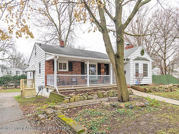 Here is the wonderful, charming Ranch style home in sought-after Glencairn that you have been waiting for! 3 bedrooms, 2 full baths with 1 of the bedrooms and baths being in the walkout lower level. The covered front porch is perfect for sitting and sipping in the warmer months and greeting neighbors who stroll by. The neighborhood with sidewalks is perfect for walking. Shopping, schools and MSU are near to this neighborhood. Enter the home and you will find a leaded glass front door, updated laminate flooring and entrance to the living areas. The step-down living room to the right of entry offers a wall of built-in shelves and cabinets, cathedral beamed ceiling with recessed lighting, bayed window, gas fireplace and hardwood floors. The spacious dining room to the left of the entry features laminate flooring, new hanging fixture, crown molding and entry to the kitchen. The functional kitchen has all the appliances for you, white cabinets, space for a small table, and exit to the basement and the side door to the driveway. There are 2 nice size bedrooms on this level, both with laminate flooring, and a full bath with ceramic tile floors, tile surround shower, new toilet, and fresh paint. There are built-ins also in the hallway as well as walk-up access to the dry storage attic. In the basement you will find the 3rd bedroom with an attached bath, a family room currently used as an office, a rec room with fireplace currently used as a playroom and an unfinished area with storage and the laundry area. Washer and Dryer remain. The walkout is in the family area and has a built-in coat rack. Off this room outside you will find a wonderful patio in the spring and the 2-car detached garage, plus a play yard mostly fenced. Under the snow is pretty landscaping! Other features- security system, vinyl replacement windows. New furnace, water heater and dryer in 2021, rear roof 2010, blown-in insulation in walls 2010.